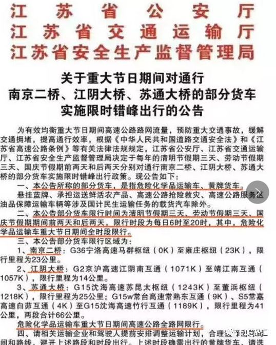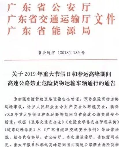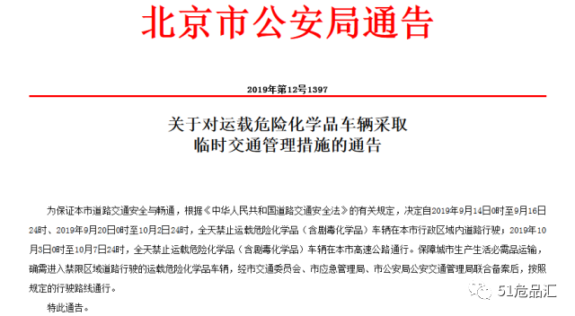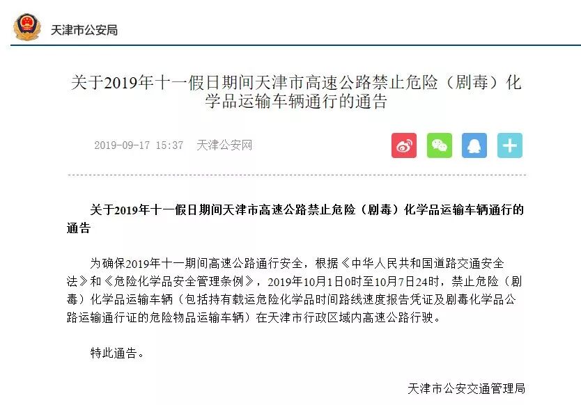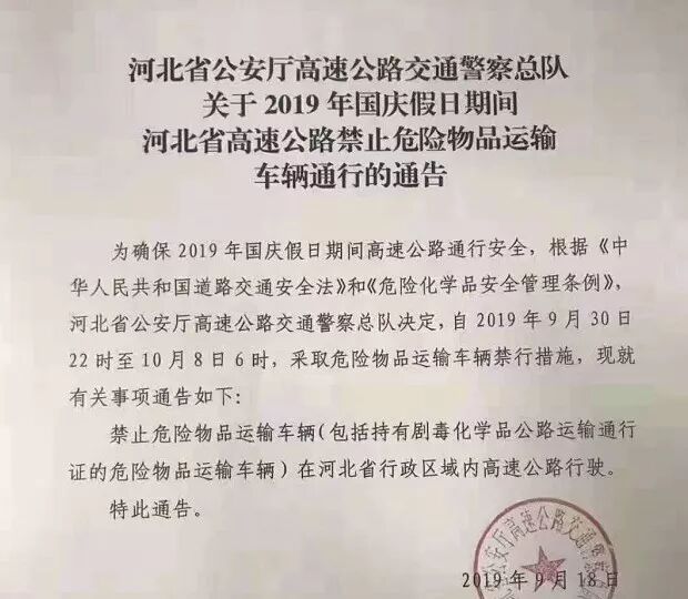 2019年9月30日22時至2019年10月8日6時,全省高速公路禁止危險化學品運輸車輛通行。2019年20日0時至10月2號24點,全天禁止運載?;奋囕v在本市行政區(qū)域道路行駛,2019年10月3號0點-10月7號24點,全天禁止?;奋囕v在本市高速公路通行,保障城市生產(chǎn)生活必須品運輸,需經(jīng)市交應公三部門聯(lián)合備案后,按規(guī)定路線通行。2019年10月1日0時至10月7日24時,禁止危險(劇毒)化學品運輸車輛(包括持有載運危險化學品時間路線速度報告憑證及劇毒化學品公路運輸通行證的危險物品運輸車輛)在天津市行政區(qū)域內(nèi)高速公路行駛。 2019年9月30日22時至2019年10月8日6時,全省高速公路禁止危險化學品運輸車輛通行。2019年9月30日22時至2019年10月8日6時,全省高速公路禁止危險化學品運輸車輛通行。2019年10月1日0時至10月7日24時,10月1日0時前已經(jīng)進入高速公路行駛的危險化學品運輸車輛,需就近駛離高速公路。為高速公路服務區(qū)、航空機場等民生項目供油、供氣的危險化學品運輸車輛,僅限于10月1日至7日夜間22時至次日6時通行,其它時段禁止通行。