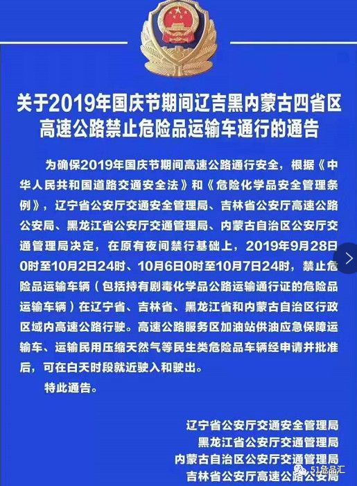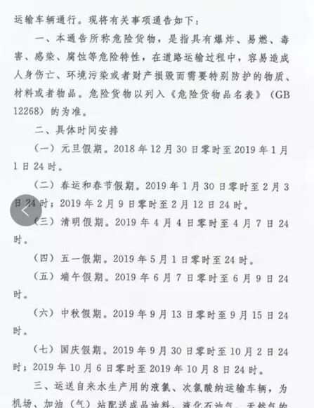 2019年9月30日0時-10月2日24時、10月6日0時-10月8日24時,禁止危險品運輸車輛高速行駛。2019年9月28日0時-10月2日24時、10月6日0時-10月7日24時,禁止危險品運輸車輛高速行駛。2019年9月28日0時-10月2日24時、10月6日0時-10月7日24時,禁止危險品運輸車輛高速行駛。
