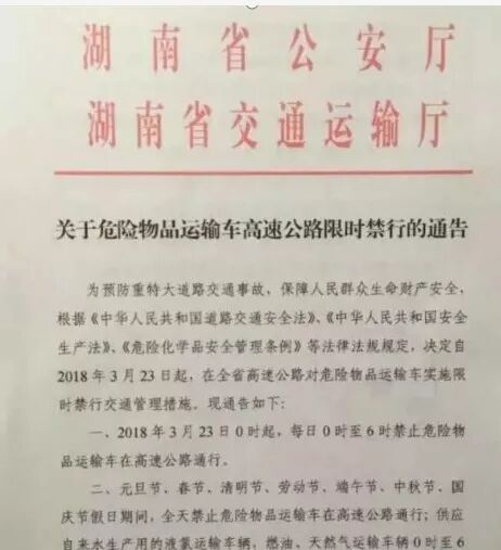 全年每日0時-6時,全省高速公路禁止危險化學品運輸車輛通行。全年每日2時-5時,全省高速公路禁止危險化學品運輸車輛通行。全年每日0時-5時,全省高速公路禁止危險化學品運輸車輛通行。2019年9月30日22時至2019年10月8日6時,全省高速公路禁止危險化學品運輸車輛通行。2019年10月1日0時至2019年10月8日6時,全省高速公路禁止危險化學品運輸車輛通行。